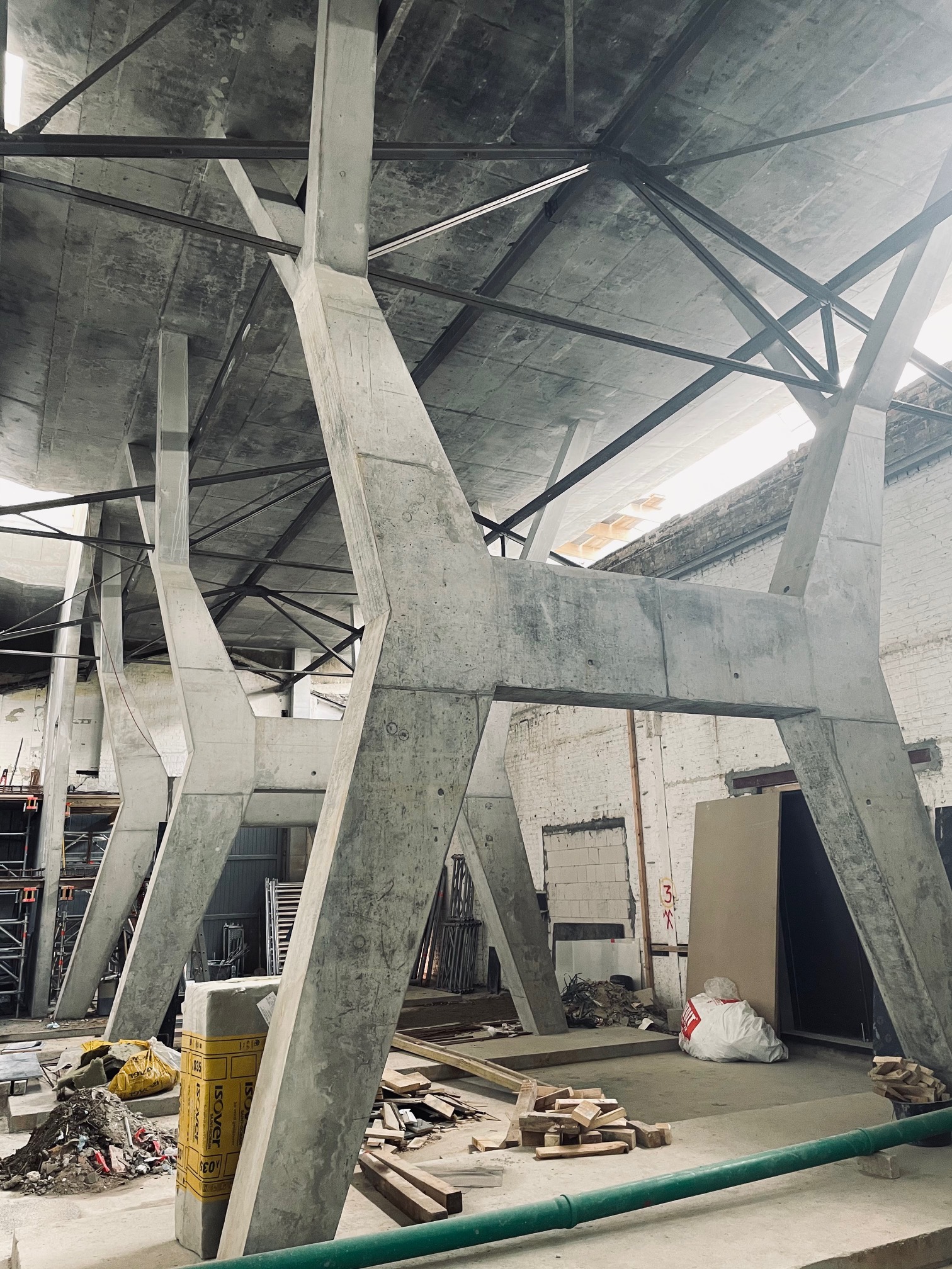 Baugrundertüchtigungen, Herstellung von HY-Stützen in Sichtbetonqualität um die denkmalgeschützte Bestandsstahlkonstruktion zur Schaffung einer „fliegenden“ Bodenplatte in Sichtbetonqualität als Gründung einer Holzbaukonstruktion